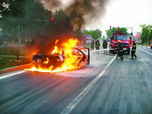 消防隊員到達現場后,發現由于汽車燃燒,油箱隨時有可能爆炸,在疏散周圍群眾后,消防戰士冒著油箱爆炸的危險,經近10分鐘的緊急撲救,大火被撲滅。(田北北 蔡勝彬)
