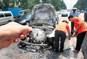據現場有經驗的司機推測,自燃原因估計是汽車在高溫情況下,電線短路或油箱漏油引發的,不過這一說法尚未得到證實。據悉,交警對此事已經介入調查。(張配吉 陸璟)
