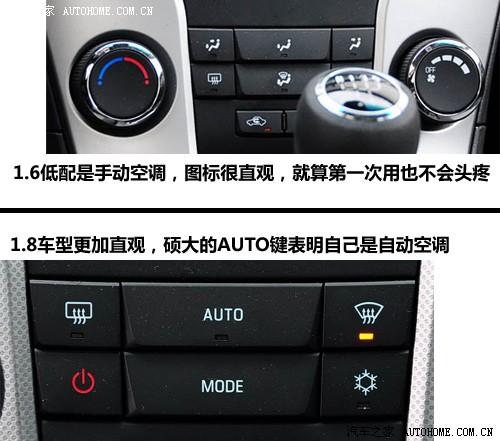 區分1.6和1.8的中控看起來比較困難,實際主要觀察空調部分的區別就能明了,科魯茲不管是手動還是自動空調都挺簡潔,上手不需要什么琢磨的時間,不過上部的音響控制區就有些晦澀了,很多按鈕如果不嘗試看字面永遠也不知道什么功能,例如TP、AS、FAV等。