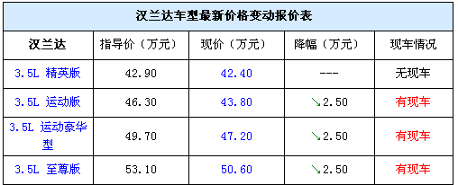 漢蘭達已在不久前停止進口,該車將于近期改為國產,目前各經銷商處均在清理庫存,近日我們從北京地區部分廣州豐田經銷商處獲悉,由于現車不多,個別經銷商處僅剩高配車型,所以此前該車高達3.5萬元的優惠幅度近期有所減小,近日購車只有2.5萬元的優惠,并且目前現車為最后一批,日后不會再有現車到店了,經銷商表示運動豪華版和至尊版的銷量不錯。