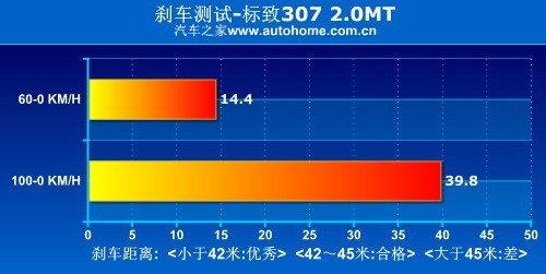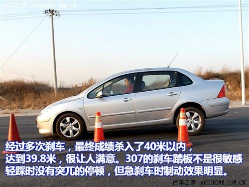 標(biāo)致307沒有裝備什么特殊的剎車系統(tǒng),也沒有速騰冠軍版那樣的寬胎,但剎車成績還是不錯(cuò)的,39.8米比我們定義的優(yōu)秀剎車距離最高線42米要短不少,而且在連續(xù)剎車測試中,剎車系統(tǒng)和輪胎的熱衰性控制的很好,基本沒有出現(xiàn)因過熱而增大距離的情況。只是由于307的懸掛調(diào)教偏軟,全力制動(dòng)時(shí)前懸掛被壓縮到極致,后輪幾乎沒有附著力,此時(shí)車輛穩(wěn)定性比較令人擔(dān)憂。