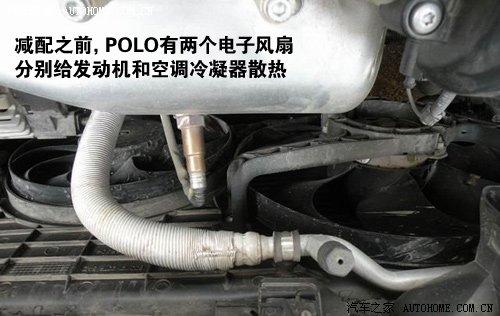 減配之前的POLO車前有一大一小兩個風(fēng)扇,一個是專門給發(fā)動機(jī)水箱降溫的大風(fēng)扇,一個是專門給空調(diào)冷凝器降溫的小風(fēng)扇。減配之后,只剩下一個大風(fēng)扇,能夠同時給兩處提供散熱。