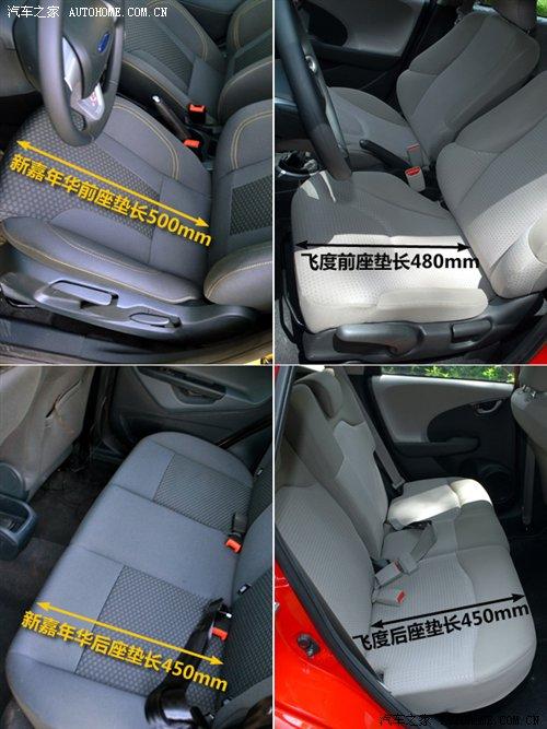 值得稱道的是新嘉年華的前排座椅,椅形設計得很不錯,包裹性和支撐性比較到位,而且前座墊的長度達到了500mm,超過了一般的小型車水平,而飛度的前座墊只有480mm。后排座墊兩者則一個水平,均為450mm。