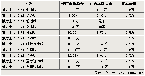 據(jù)廣州豐田4S店銷售人員介紹,目前廣州豐田各4S店內(nèi)雅力士1.3L現(xiàn)車較少,而1.6排量的車型就相對比較充足,并可提供試乘試駕服務(wù)。銷售人員表示,現(xiàn)在到店購買雅力士的消費者可享受到最高達(dá)2.5萬的價格優(yōu)惠,還可得到商家贈送的簡單裝飾等。消費者可在展廳內(nèi)近距離接觸展車、親身體驗試駕車后直接購買現(xiàn)車。
