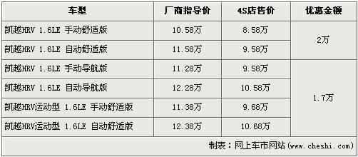 據(jù)經(jīng)銷商處銷售人員介紹,凱越HRV共有6個(gè)車型在售,近期除了舒適版現(xiàn)金優(yōu)惠仍然是2萬元外,其他4款車型的優(yōu)惠都上升到了1.7萬元。入門車型的凱越HRV 1.6LE 手動(dòng)舒適版現(xiàn)金優(yōu)惠售價(jià)仍為8.58萬元。而導(dǎo)航版與運(yùn)動(dòng)版車型優(yōu)惠金額都從1.6萬元漲到了1.7萬元,但是此兩版車型店內(nèi)均無現(xiàn)車,欲購買的消費(fèi)者需交訂金1萬元,最早兩周內(nèi)可以提車。