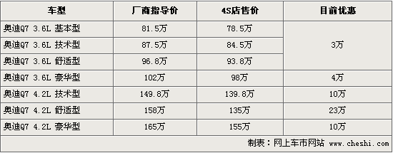 據奧迪4S店銷售人員介紹,目前銷售的奧迪Q7包括了3.6和4.2排量共7款車型。消費者在購買的同時可以選擇個性化選裝配置,其中包括了座椅顏色,內飾顏色,剎車盤,音響等一系列配置,據介紹,選擇個性化配置后,車價將有相應增加。同時消費者可以直接購買原車型,目前全車系3.6排量三款車優惠3萬元現金,豪華版優惠4萬。而4.2舒適型最低可優惠到135萬,降幅達23萬。目前4S店現車主要以黑色為主,內飾有灰色、米色可供選擇。