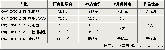 據沃爾沃4S店銷售人員介紹,目前銷售的沃爾沃XC90均是09款新車,其中2.5T帆船紀念版車型和3.2兩個排量車型可優惠現金3萬元,其他2.5T標準版和4.4旗艦版沒有優惠。現車方面,4S店有藍色款現車供應,個別款顏色需要消費者先行預定。