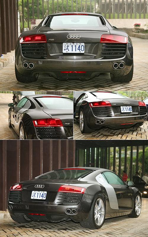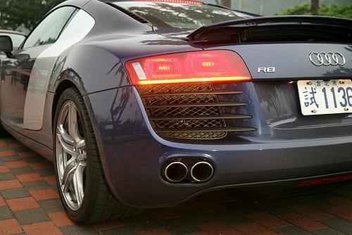 在車尾下部,R8采用左右對稱的四出排氣管設計,并很好的融合于車體之中。而車底也備有底盤擴散板的設計,搭配擾流尾翼,達到空氣力學優化的要求。