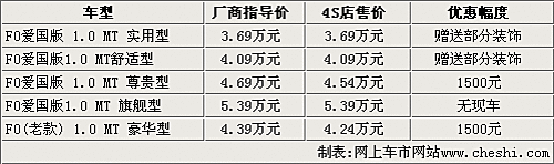 據(jù)比亞迪汽車4S店銷售人員介紹,現(xiàn)在比亞迪F0愛國版igo系列車型的現(xiàn)車比較齊全,只有旗艦型沒有現(xiàn)車,但消費者可以預訂。售價3.99萬元的老款舒適型現(xiàn)在已經(jīng)停產,而老款豪華型目前還有部分現(xiàn)車銷售。另外,比亞迪FO老款豪華型和尊貴型目前都可以優(yōu)惠現(xiàn)金1500元,實用型和新舒適型只可以贈送部分裝飾。