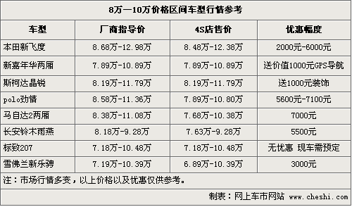 三、8萬—10萬之間匯集了眾多明星級車型,也是眾多合資品牌競爭最為激烈的陣地。新上市的新嘉年華兩廂、斯柯達晶銳、標致207都是最好的證明。這個區(qū)間車型外觀亮眼個性,內(nèi)飾空間和操控性各方面表現(xiàn)各異。新飛度、雨燕省油好看,馬自達2、勁情操控不錯,嘉年華和晶銳期待在市場上有更好的表現(xiàn),每款車各有所長,跑在大街上絕對是一道靚麗的風景。