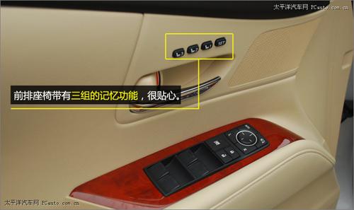 將目光轉移到中央扶手側,我們發現雷克薩斯的前排座椅帶有三組記憶功能,很貼心。電動后視鏡調節按鈕、車窗升降按鈕亦集中在駕駛員一側的門把手上。