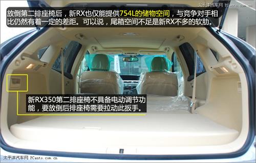 即使放倒了第二排座椅,新RX也只能提供754L的儲物空間,與一種德、美系車型動輒超過1500L的后排儲物空間相比,仍然有著一定的差距。可以說,偏小的儲物空間是新RX350上不多的軟肋。