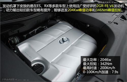 在新RX350上沿用了廣受好評的2GR-FE V6發動機。這款發動機經過重新調校后,動力輸出較舊款的RX350略有提升,能夠迸發204Kw峰值功率和346Nm峰值扭矩。最高時速可達200Km/h,0-100Km/h加速也僅需7.9s。先期引入國內的RX系列車型并沒有使用混合動力系統,不過想必一向對環保十分重視的雷克薩斯品牌會在不久的將來將搭載有混合動力系統的RX車型引入到國內市場,豐富RX的產品線。