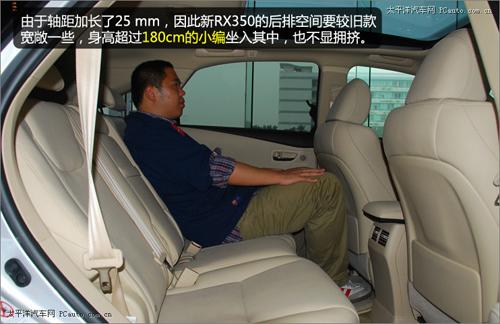 前文已經提過,新RX350的車身長度要較舊款長30 mm,軸距也較舊款長25mm,因此新RX350的后排空間要較舊款寬敞一些,身高超過180 cm的小編坐入其中,也不顯擁擠。不過由于車身高度較舊款車型有所降低,RX350后排的頭部空間與舊款相比沒有什么優勢可言。