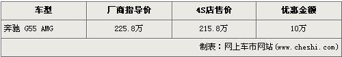 根據北京奔馳4S店銷售人員介紹,目前奔馳G55 AMG現金優惠10萬元。經優惠后,奔馳G55 AMG售價從廠商指導價的225.8萬元下降到了215.8萬元。銷售人員還介紹,奔馳G55 AMG只有一部黑色現車在售,而且北京多家奔馳經銷店均無現車,消費者挑選的空間不大。顏色方面引進國內的G55 AMG只有黑色,其他顏色均不銷售。