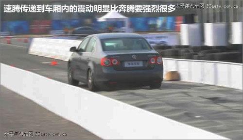 濕滑路面體驗這個項目主要是模擬冰雪路面的對于車輛的操控,在光滑的鋼板上潑上水附著力減小,在通過彎道時速騰依舊過早的出現轉向不足的情況,不過方向盤的指向依舊保持的較為精準。奔騰在高速過彎時側傾要小于速騰,不過路感不是特別清晰,電子穩定系統起到的作用非常明顯,底盤在舒適性和運動性間找到了平衡點。
