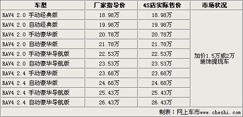 2009年4月10日,一汽豐田正式推出了首款SUV車型RAV4,售價18.98-26.43萬元。作為一款日系經典城市SUV車型,起初以進口方式銷售時就得到了廣大消費者的喜愛,此次國產后由于價格較進口車型有所降低,進一步提升了RAV4的性價比。那么剛剛上市RAV4的市場狀況究竟如何呢?記者在走訪北京地區一汽豐田4S店時了解到:目前國產RAV4現車現已到店,但是由于貨源比較緊張,消費者需要加價1.5萬元或2萬元裝飾才可以提到現車。具體車型售價見下表:
