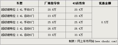 據4s店銷售人員介紹,目前店內銷售的新超級維特拉全系優惠5000元。低配的3門版2.4L 5速手動車型最低售價降為20.4萬元,而排量稍大采用5速自動變速器的5門版3.2L車型經優惠后售價也降為33.4萬元,是全系最高價。店內現車顏色方面,新超級維特拉有黑、灰、白三個顏色供消費者選購。