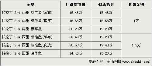 據4s店銷售人員介紹,帕拉丁兩驅車型的優惠金額為1萬元,四驅車型的優惠金額為1.2萬元。帕拉丁為2.4L,車系分為前置后驅和前置四驅兩種驅動形式,每種驅動形式中又分為標準版及豪華版,標準版分為絨布座椅或真皮座椅。絨布座椅全系最低配的帕拉丁 2.4兩驅標準版經優惠后售價降為15.48萬元,而操縱性能更加穩健,全系最高配的帕拉丁 2.4四驅豪華版經優惠后售價也降到了23.28萬元。目前帕拉丁兩驅與四驅的豪華車型均無現車,欲購買的消費者需交訂金1萬元,兩周后可提車。