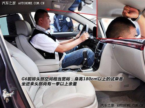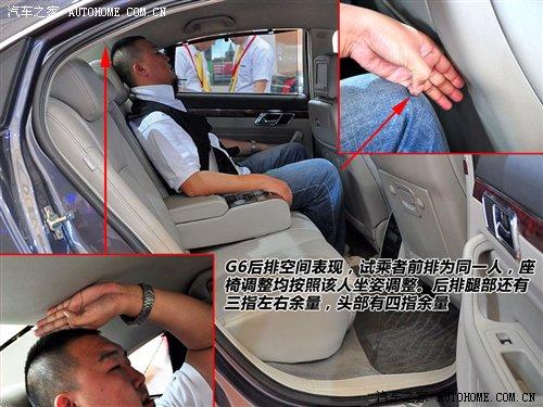 對于這種大尺寸車型最慣性的思路是感受它的空間。G6前排坐進180cm以上乘客時,頭部還有一拳以上余量。同一個人體驗后排,腿部三指、頭部四指的空間余量只能說比較一般。
