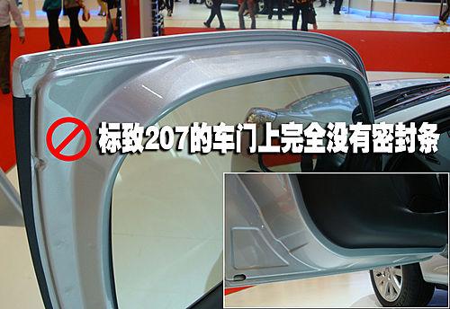 標(biāo)致207在車門一側(cè)完全沒有設(shè)計密封條,在其車門上也沒有任何可以固定密封條的固定點(diǎn)。不過在車身一側(cè)門框的位置設(shè)計了兩道密封,不過盡管是這樣標(biāo)致207依然是這項對比中最差的一個。