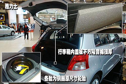 我們看到豐田雅力士的行李箱與備胎之間的蓋板上設計了非常厚的一層隔音材料,并且備胎兩側的工具箱都是做工非常精良的塑料材質整體上看非常整齊美觀。