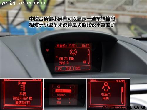 中控臺頂部的顯示屏雖然很小,但是在小型車中還是不多見的,而且功能也比較豐富,包括時間、音頻、車輛信息和一些簡單功能設(shè)置。比如可以調(diào)節(jié)音效,收音機(jī)的選臺存臺,CD播放等,基本上以音頻信息為最有用的。此外,還有車輛警示信息,比如車門未關(guān)、自動擋擋位沒在P擋等,而且警示信息顯示時還有紅色進(jìn)度條一直在行進(jìn),進(jìn)度條結(jié)束了信息也就不顯示了。