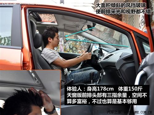 新嘉年華的前排頭部空間表現尚可,即使是在這款有天窗的車型上,尚有一部分余量,而像圖上這位身高178cm體重150多斤體驗人算是標準偏胖一點的亞洲人身材了,而之前試駕時那位身高185cm的瘦小伙也還是能輕松地坐進去。