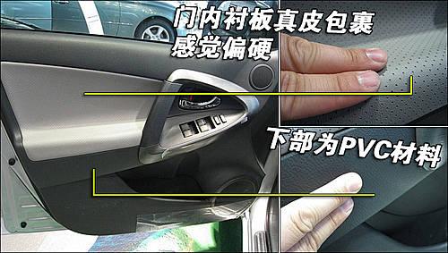 門內(nèi)扶手為皮革包裹,但感覺(jué)偏硬。門內(nèi)襯板為塑料材質(zhì)。