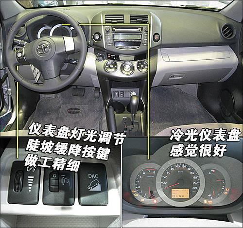 豐田國產(chǎn)RAV4凸顯出該車的運動風格,在內(nèi)飾設計上采用深色設計。兩小一大的冷光儀表盤,感覺很舒服,駕駛員可以查看比較輕松。儀表盤燈光調(diào)節(jié)、陡坡緩降按鍵位于方向盤左側(cè),用料感覺相對比較精細。