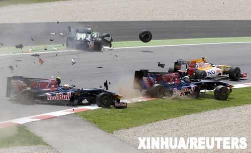5月10日,紅牛二隊車手布爾代(前中)和隊友布埃米(前左)以及印度力量車隊車手蘇蒂爾(后)、雷諾車隊車手皮蓋駕駛的賽車發生碰撞。當日,F1西班牙大獎賽落幕,布朗GP車隊的英國車手巴頓奪得冠軍。新華社/路透
