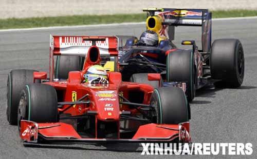 5月10日,法拉利車隊車手馬薩(前)與紅牛車隊車手維泰爾駕駛的賽車在比賽中。當(dāng)日,F(xiàn)1西班牙大獎賽落幕,布朗GP車隊的英國車手巴頓奪得冠軍。新華社/路透