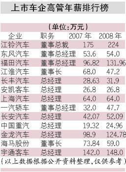 4月底所有上市車企披露了2008年年報,高管薪酬也浮出了水面。2008年并不算是個好的年份,上半年市場尚好但遭遇了成本高漲的壓力,下半年市場急劇降溫,企業(yè)利潤也快速下滑。但上市公司高管的薪酬基本上還是穩(wěn)中有升,當然,與2007年同比2006年的大幅增長不可同日而語。商用車企業(yè)的薪酬要遠高于乘用車車企高層,高管薪酬超過100萬元的全是商用車企業(yè)。