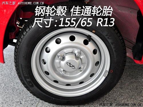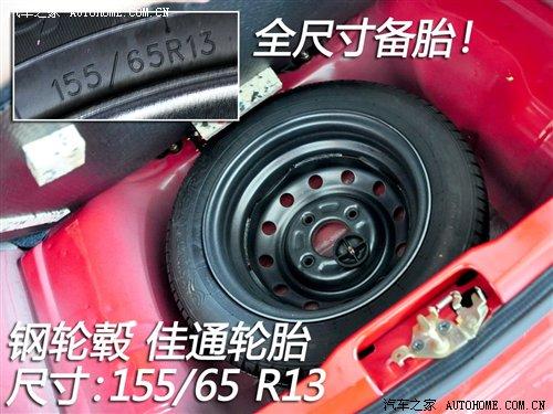 QQ3全系配備的輪胎尺寸為155/65 R13,品牌為佳通。這樣的尺寸在0.8車型上還算中規中矩,而1.1車型還配備這樣尺寸的輪胎在同級別中就顯得有點寒酸了。QQ3也有鋁合金輪轂可供選擇,我們實拍的這樣裝備的是鋼輪轂,備胎都屬于全尺寸的。