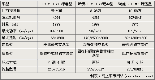 在動力方面,三款車中獵豹只有2.0L排量可選,而哈弗有2.0L、2.4L以及2.8T柴油可選,而瑞虎也有1.6L、1.8L和2.0L 可以選擇,以2.0L的動力對比來看,瑞虎的SQR484F發動機從數據上看最為強勁,而哈弗H3的4G63在低速扭矩方面具有優勢。在懸架系統方面,三款車中CS7采用了偏重越野的整體橋式后懸掛,但舒適性上不如另兩款車型。