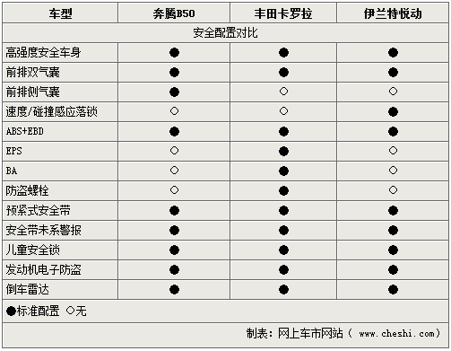 在安全裝備上,奔騰B50五款車型采用的是同樣的配置,前排雙氣囊、駕駛員自動預(yù)緊安全帶、駕駛員安全帶未系報警等都為標(biāo)配,防炫目內(nèi)后視鏡、后門兒童鎖、間歇式寬幅雨刷都為保障駕駛安全設(shè)計。對比另外兩款車型則少了EPS以及BA等輔助安全系統(tǒng)。