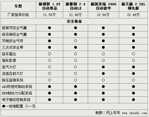新領馭、新雅閣、新凱美瑞和新天籟作為中級車標桿,其在安全性能方面可謂是下足了功夫。前排安全氣囊、側安全氣囊及電子穩定程序等均成為四款車的標準配置。而新凱美瑞和新天籟配備了自適應氙氣大燈,較其它兩款車提升了夜間行駛安全性。除此之外,新雅閣是四款同級車型中唯一沒有配備側氣簾的車型,讓人略感遺憾。