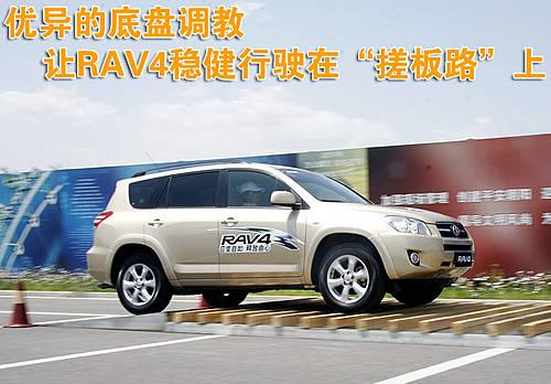 RAV4城市休閑SUV優異的底盤調教,使其行駛在模擬“搓板路”上時,車內駕乘人員感覺車兩依然平穩舒適。似乎整個RAV4車身懸浮在底盤之上,之間前后懸架在上下調節從而適應路面狀況。
