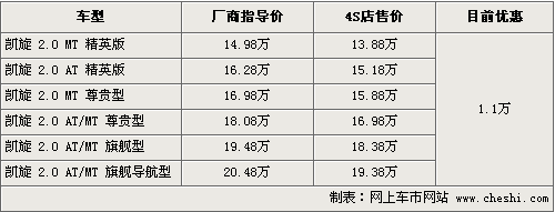 據4S店銷售人員介紹,目前購買凱旋可以優惠1.1萬元,目前現車主要都是自動檔車型,主要有黑色、灰色可供選擇,而手動精英型和手動尊貴型則需要接受預訂,訂金為1000元,10個工作日可提車。