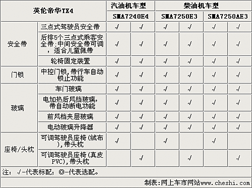 英倫TX4的后排帶有五個(gè)三點(diǎn)式安全帶,并且后排還帶有輪椅固定裝置。TX4配備了中控門鎖,帶行車自動鎖止功能,后風(fēng)擋玻璃也可以加熱,并且?guī)в凶詣訑嚯姽δ堋X4的高配車型都配備了真皮座椅,低配車型采用絨布材料座椅。