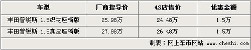 據(jù)4S店銷售人員介紹,目前普銳斯全系有兩款車在售,售價(jià)分別為25.98萬和27.98萬元,現(xiàn)在購(gòu)車的話可以優(yōu)惠現(xiàn)金1.5萬元。款式和顏色不太齊全,訂車的話周期比較長(zhǎng),需等大概2個(gè)月時(shí)間。