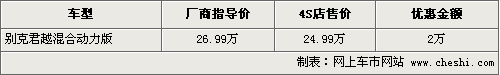 據(jù)4S店銷售人員介紹,目前購買君越混合動力車型最高可以優(yōu)惠現(xiàn)金2萬元,原來指導(dǎo)售價為26.99萬元,優(yōu)惠后售價為24.99萬元,相當(dāng)于導(dǎo)航版車型的價格。目前經(jīng)銷商處有黑色的現(xiàn)車供應(yīng)。