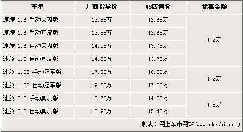 據經銷商銷售人員介紹,速騰1.6L和1.8T冠軍版車型均優惠1.2萬元,而2.0L車型優惠1.5元達到了全系的最高。1.6L排量車型經優惠1.2萬元后,入門級的手動天窗版售價降為了12.68萬元,為全系最低價。經優惠后1.8T的手動型與自動型售價分別降到了16.68萬元和17.88萬元。高排量的2.0L車型經優惠1.5萬元,手動型和自動型售價分別為14.28萬元及15.48萬元。銷售人員還介紹,店內1.6L車型現車較充足,消費者挑選的空間大。