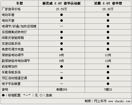 在豪華配置方面,新君威2.0T和邁騰2.0T更是不遺余力的配備各自高端配置,電動天窗、定速巡航、電動座椅、座椅電加熱以及分區自動空調均稱為兩款車的標準配置。但新君威2.0T配備的電磁隨速轉向系統,讓其整體的操控性略高于邁騰2.0T。此外,邁騰2.0T配備的電子手剎、12向電動真皮坐椅和電動折疊后視鏡等配置,似乎要比新君威2.0T更加時尚。