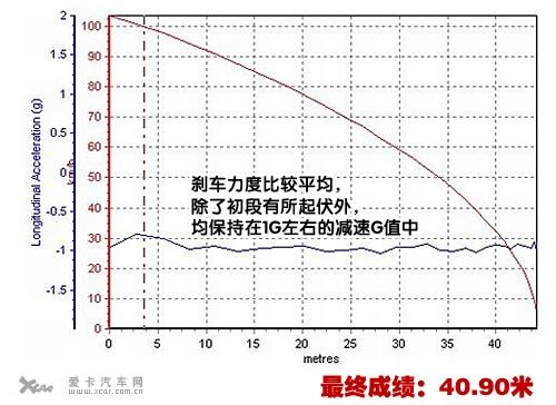 隨著右腳不斷對剎車踏板施壓,穩定的剎車軌跡使車輛的行駛方向幾乎沒有改變。從圖表中我們可以看出,整個剎車過程中,邁騰的剎車力度比較平均,除了初段有所起伏外,均保持在1G左右的減速G值中。