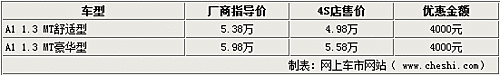 據(jù)銷售人員介紹,奇瑞A1目前可以優(yōu)惠4000元,但豪華型現(xiàn)車不足,部分顏色需要預(yù)訂。而且個(gè)別4S店的并沒有豪華型現(xiàn)車,也需要預(yù)訂,訂金為2000元。