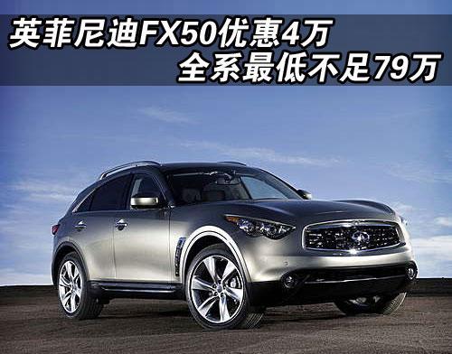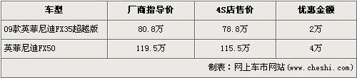 據(jù)英菲尼迪4s店銷售人員介紹,目前店內銷售的FX系列有FX50和09款FX35兩款車型。英菲尼迪FX50近期出現(xiàn)了首次優(yōu)惠,降幅為4萬元,經優(yōu)惠后售價從119.5萬元降到了115.5萬元。并且09新款的FX35超越版車型有2萬元優(yōu)惠,售價也降到了78.8萬元。