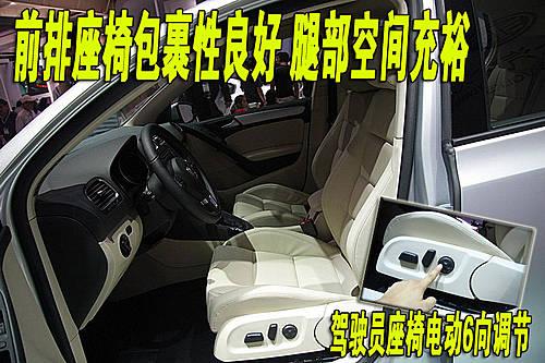 第六代高爾夫整車座椅均采用真皮材料,駕駛席座椅前后、靠背角度、座椅高度為電動調節。各按鈕四周做工較細致,但感覺比較松垮。乘坐時可以感覺到前排座椅對于背部的支撐與包裹十分到位,同時前排座椅坐墊長度也很合適,對大腿部分的支撐充足。