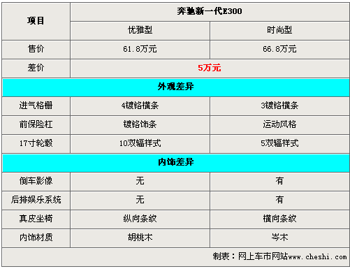 奔馳新E300優(yōu)雅型和時尚型5萬元的差價,主要體現(xiàn)在外觀和內(nèi)飾等配置上。奔馳新E300時尚型標配的倒車影像、17寸5雙輻合金輪轂、橫向條紋座椅、岑木內(nèi)飾以及后排娛樂系統(tǒng)均沒有出現(xiàn)在奔馳新E300優(yōu)雅型上。