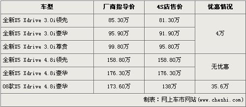 據經銷商處銷售人員介紹,店內還有一輛售價為173.6萬元的08款X5 4.8i豪華版現車,目前此批車有35.6萬元的優惠,經優惠后售價降到了138萬元。銷售人員還介紹,新款X5-30i車型有4萬元的優惠,4.8i車型沒有優惠。